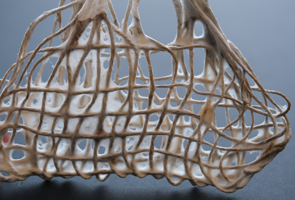 This project examines how we can design bio-receptive structures from jute and hemp with and for mycelium. A material-driven design approach is applied by systematically changing variables such as humidity, spacing, and interaction. The result are different material potentials that mycelium offers, like flexibility, the binding ability to lock in a weave, and regrowth of dried samples and this introduces temporality in the rhythm of drying, interaction and growing.